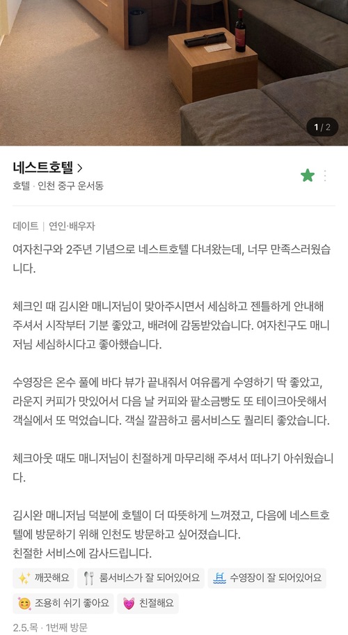 ¾Æ½¬¿î °ÍÀÌ ÀÖ´Ù ÇØµµ °á°úÀûÀ¸·Î´Â ¸¹Àº Á÷¿øºÐµéÀÇ ÀûÀýÇÑ ¼ºñ½º ´ö¿¡ ³×½ºÆ®È£ÅÚ ¼÷¹ÚÀÇ °æÇèÀÌ ÁÁÀº ±â¾ïÀÌ µÈ °Í °°½À´Ï´Ù. °¨»çÇÕ´Ï´Ù.